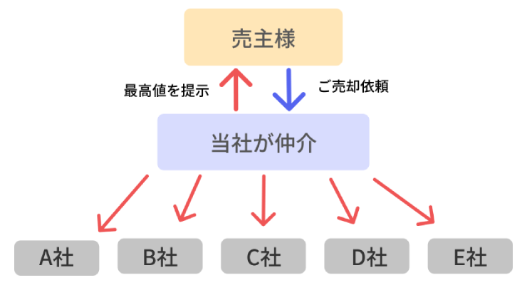当社が売主様、買取業者様との仲介会社として、ご要望・ご条件をお聞きし、買取価格打診、交渉、契約書類作成、お引き渡しまで、当社が仲介させていただきます。仲介手数料は必要となりますが、直接交渉の煩わしさ無くなるだけでなく、下図のように、複数の買取業者に入札形式にすることで、客観性を持った売却価格の判断をすることが可能になります。手数料を払ってもご希望額の手取りを超えれるよう、当社が全力を尽くします。